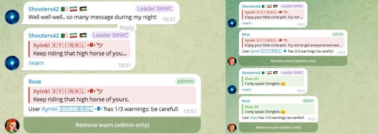 你再听这句——“来自IWWC的非洲管理员@Shooters42在醒来之后马上给已经被禁言的@Xyinkl来了个警告”