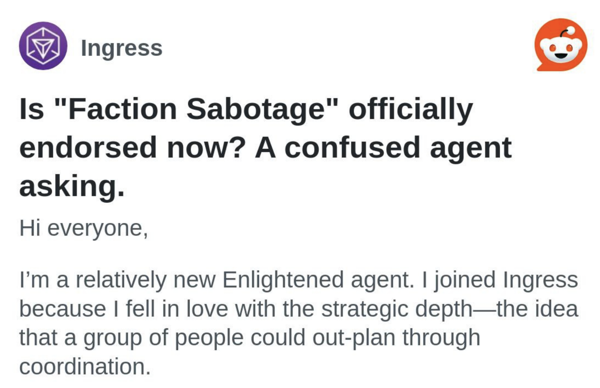 比如在北京碎片战后,有绿军注册空白小号发表了这个帖子《Is "Faction Sabotage" officially endorsed now? A confused agent asking.》,在其中装作自己是无辜的新手,被中国蓝军正常的游戏行为伤害到了。