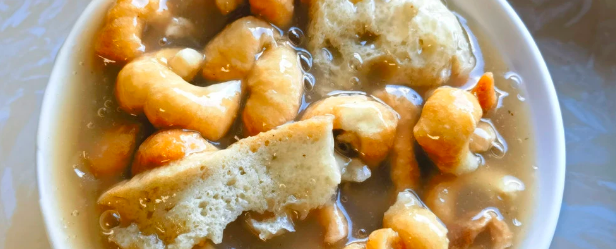 ”将煮熟的鸡肉撕成条状,加入适量鸡汤,放入盐、花椒、姜等调料,熬成糊状,吃的时候再放入麻花、粉皮、面筋等,味道真的很棒。“
